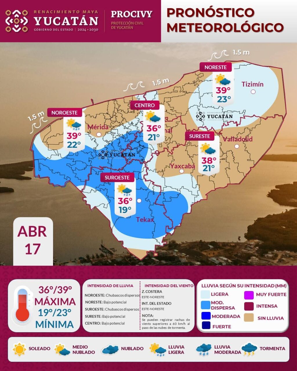 ¡Qué onda con este calor de viernes! Hoy 17 de abril, la Península de Yucatán se siente más viva que nunca con temperaturas que podrían llegar a los 39°C en el interior. Gracias a una vaguada, es probable que caigan algunas gotas de lluvia, pero el ambiente caluroso persistirá, así que no guardes el abanico ni descuides la hidratación.