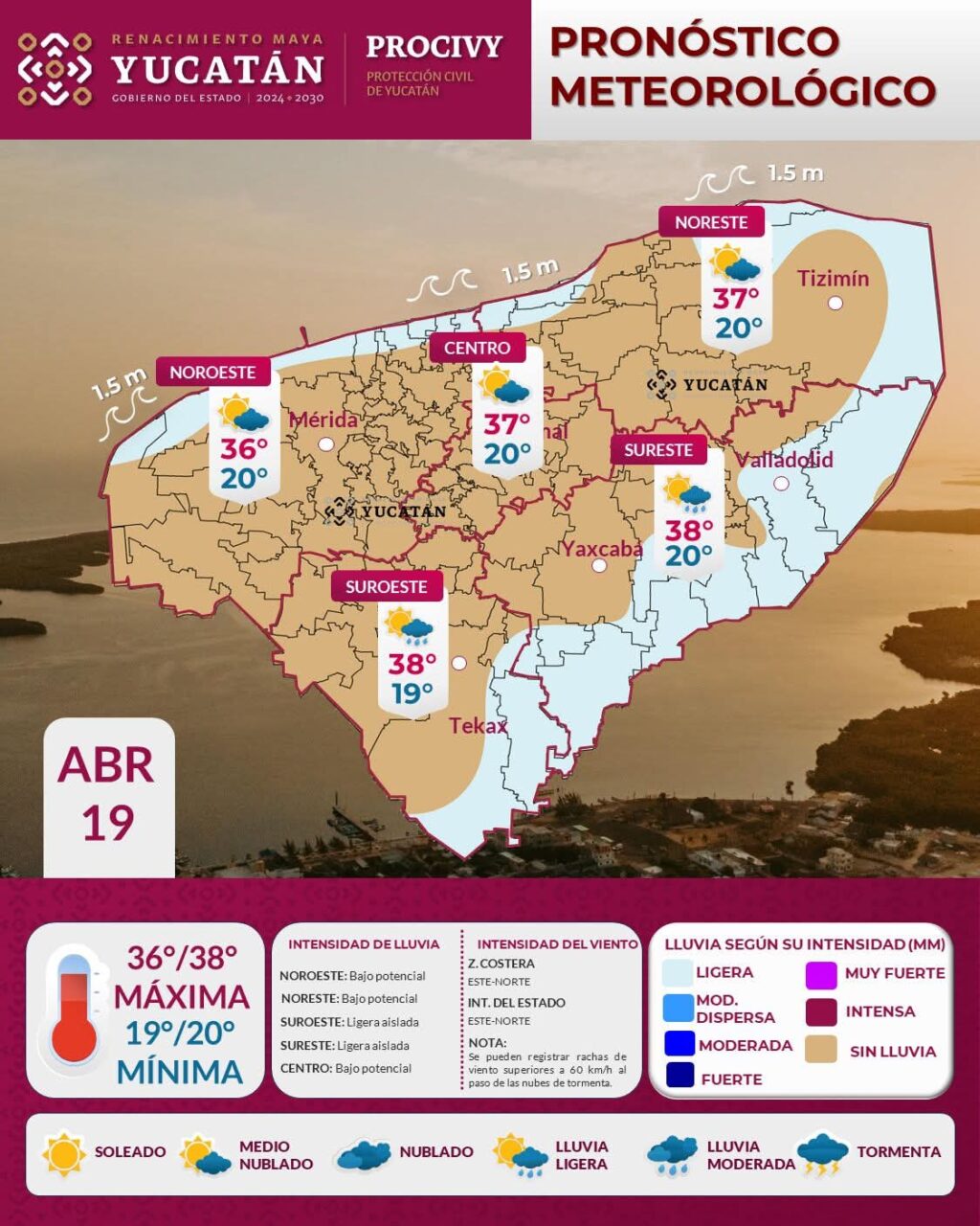 ¡Buenos días, Yucatán! Este 19 de abril el ambiente caluroso será el protagonista con temperaturas máximas de 36 a 38°C en el interior. Si buscas algo más fresco, la costa es tu mejor opción, ya que los termómetros no pasarán de los 29°C. ¡Ideal para un pescado frito frente al mar!