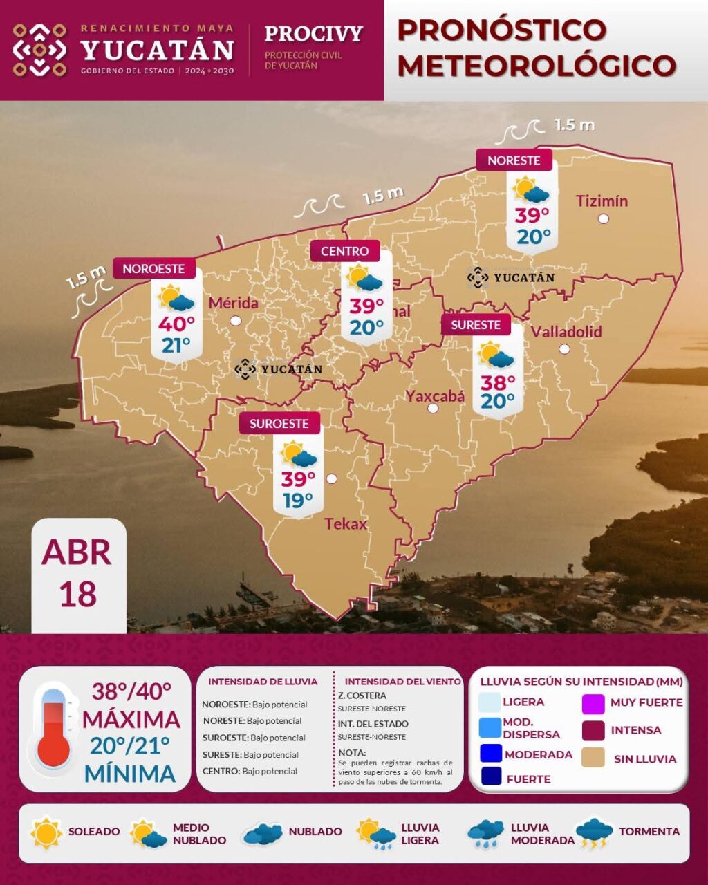 Con la llegada del fin de semana, muchas familias planean actividades al aire libre; sin embargo, este sábado 18 de abril exige máxima precaución. El sistema de alta presión mantendrá un ambiente “muy caluroso” en todo Yucatán, con picos de 40°C en zonas como Samahil y Chocholá.